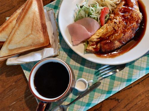 早起きしたときは、よく「もりの精」にいく。 そして、お決まりのモーニングのBセットを注文。 はじめてこのオムレツを食べてからというもの、ほかのメニューも気になりながらも、モーニングはBセットしか頼んだことがない。 若干のふわふわ加減のちがいまで…